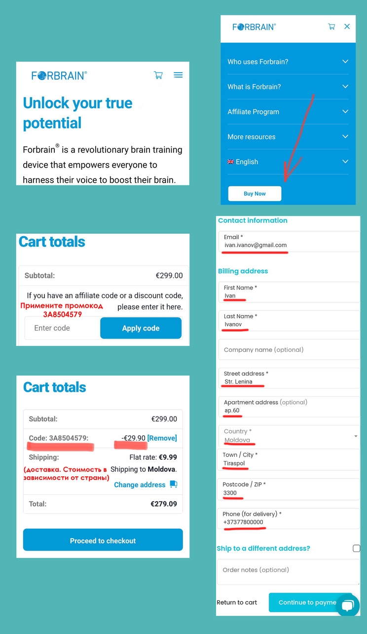 II. Либо зайти на сайт forbrain.com ввести мой промокод 3A8504579. Обязательно открывать английскую версию сайта. Так как если вы выберите русский язык, вас перебросит на сайт дилера, у которого цена выше, чем на сайте производителя